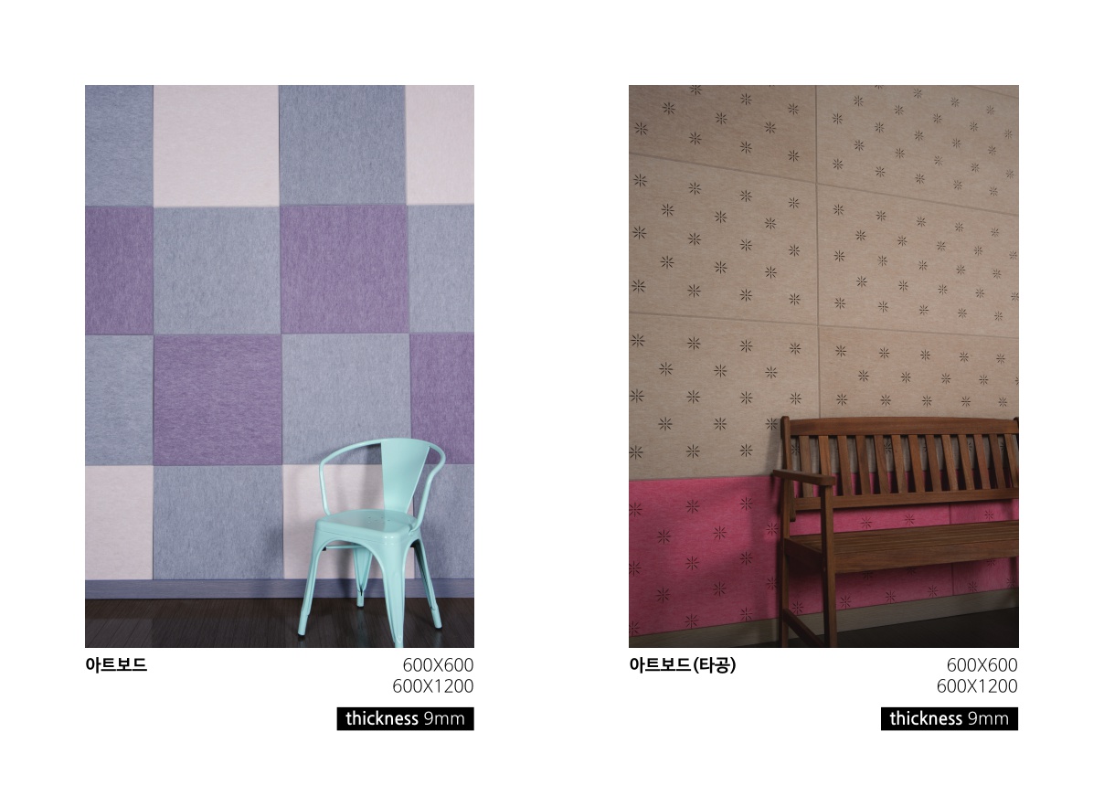 With 9mm thickness, unique design interior is realized by a wide cutting patterns from punching to puzzle with own design in various space environments. Because, as a 100% polyester (Environment-friendly product), it is soft and light, it can be built easily. And it does not crumble or break. Because it is strong against humidity and it discharges the moisture, it makes it impossible for the fungus or the mites inhabit.